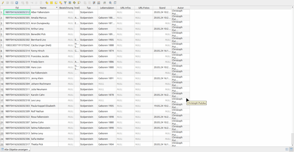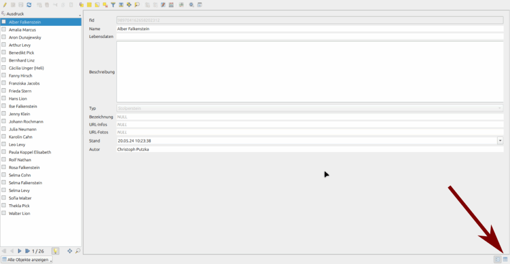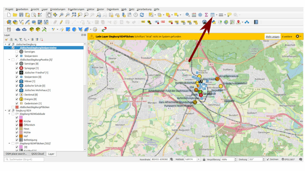 Wenn man dass Projekt gestartet hat sieht man die Karte mit dem Menü an der Seite wo man die einzelnen Ebenen und Punkt ein  und ausblenden kann wenn man eine der Ebenen im Seiten Menü auswählt kann  man wenn man auf das markiert Symbol eine liste mit allen Punkten in dieser Kategori erstelt sieh negstes Bild.